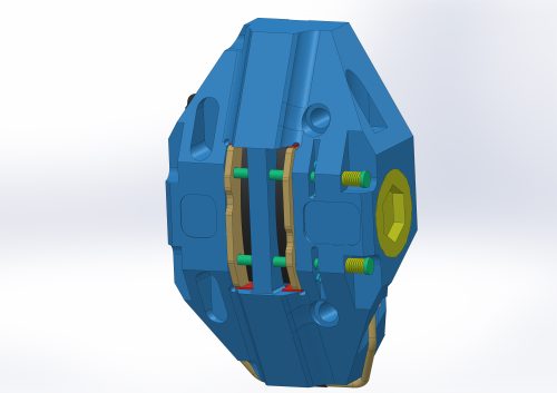 Two piston aluminium brake caliper with radial mounting for solid disc.